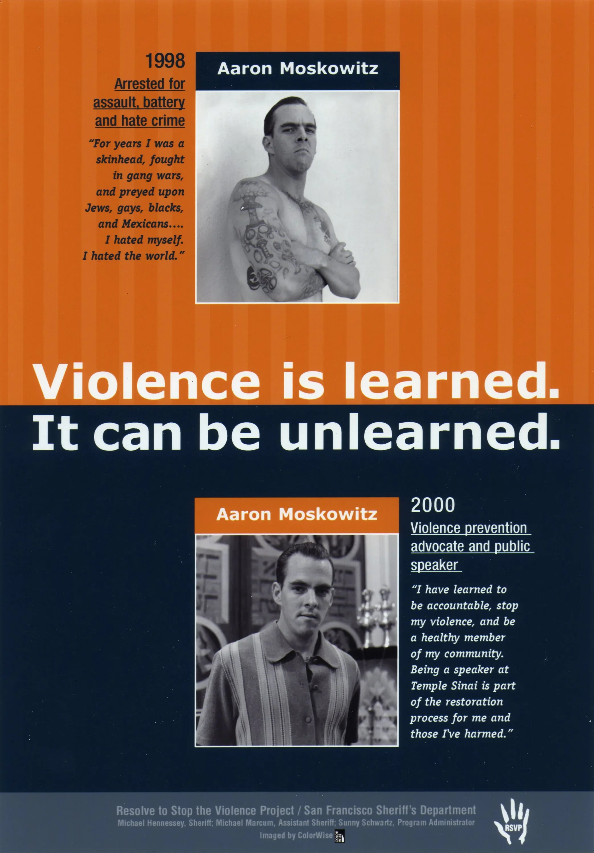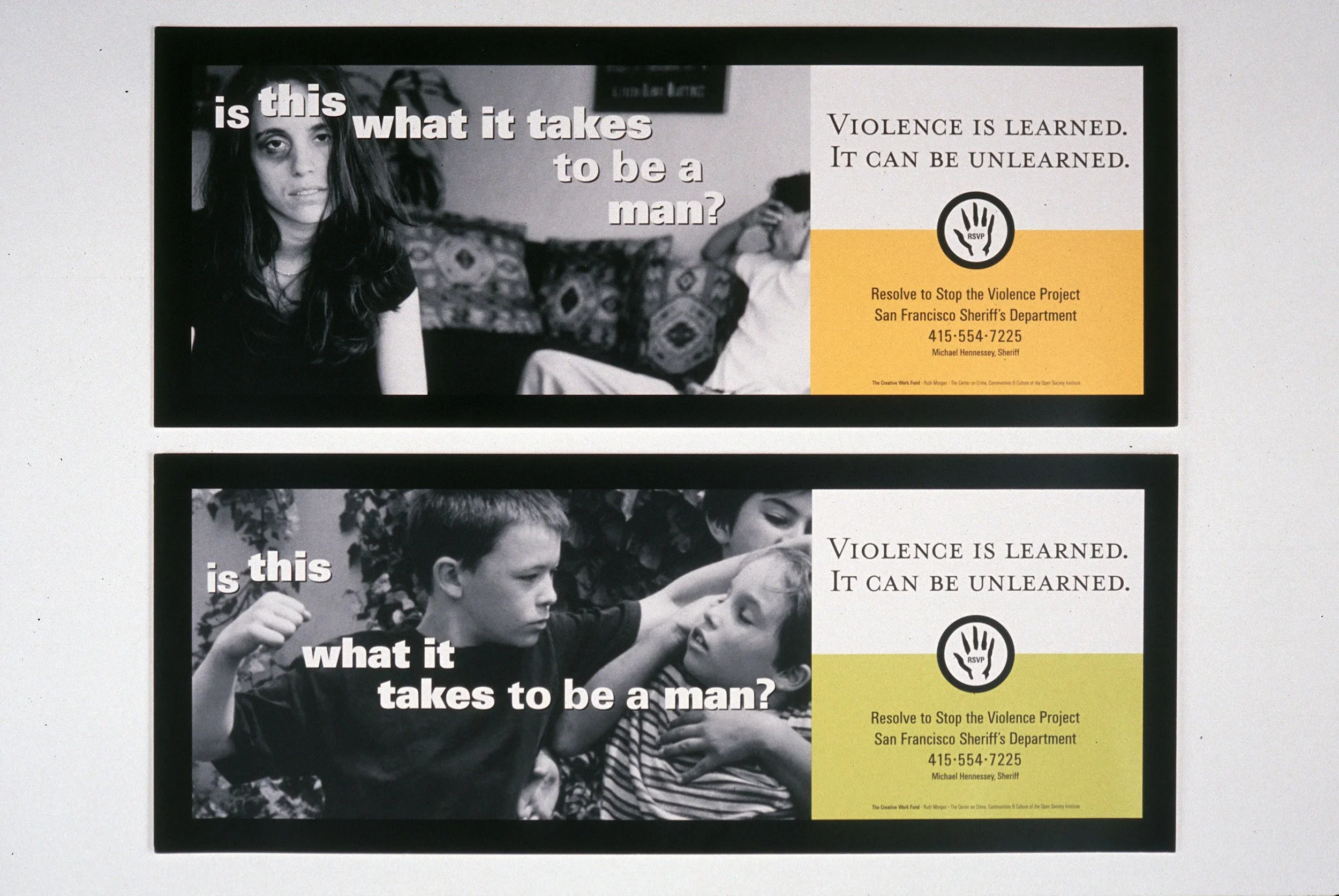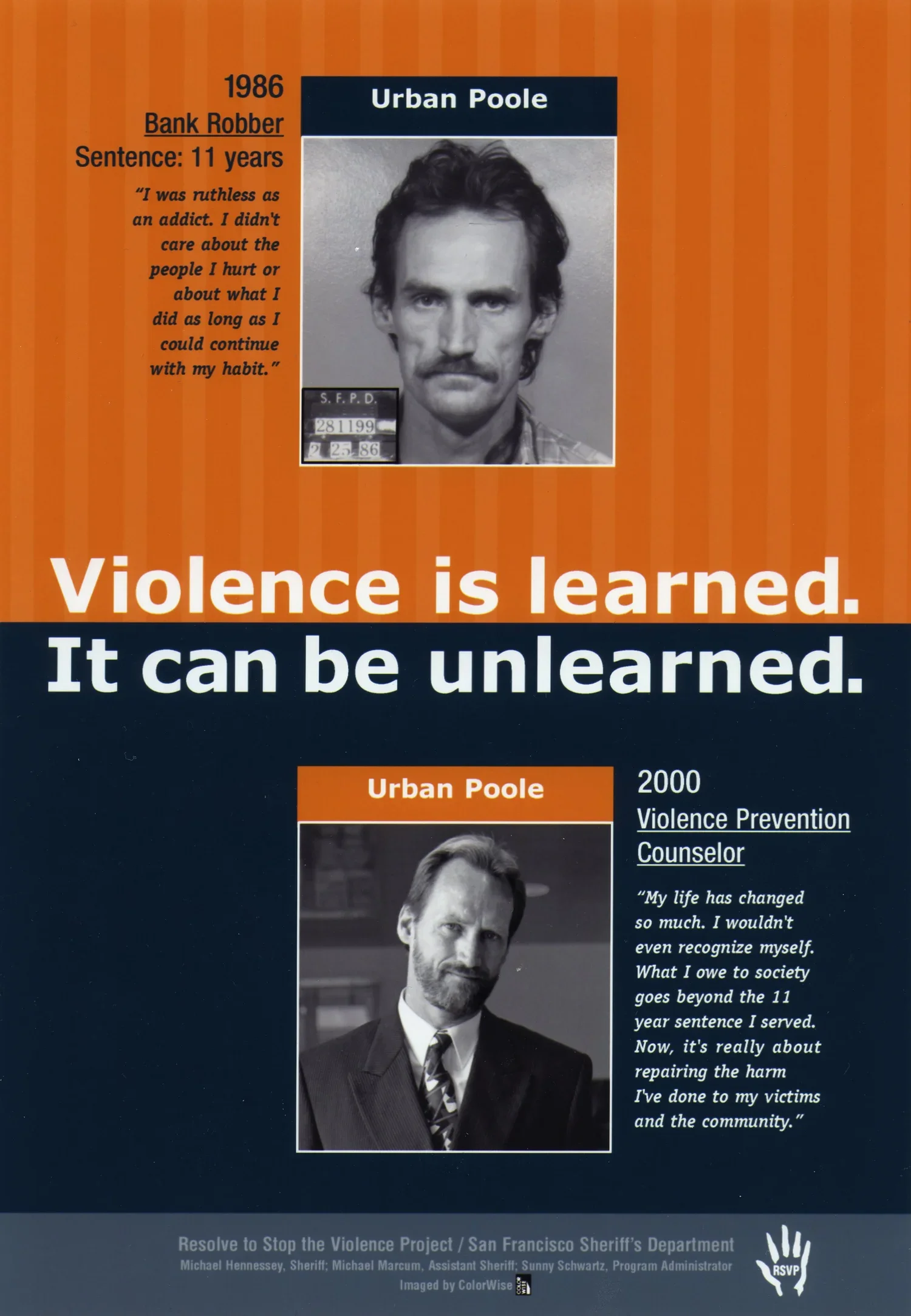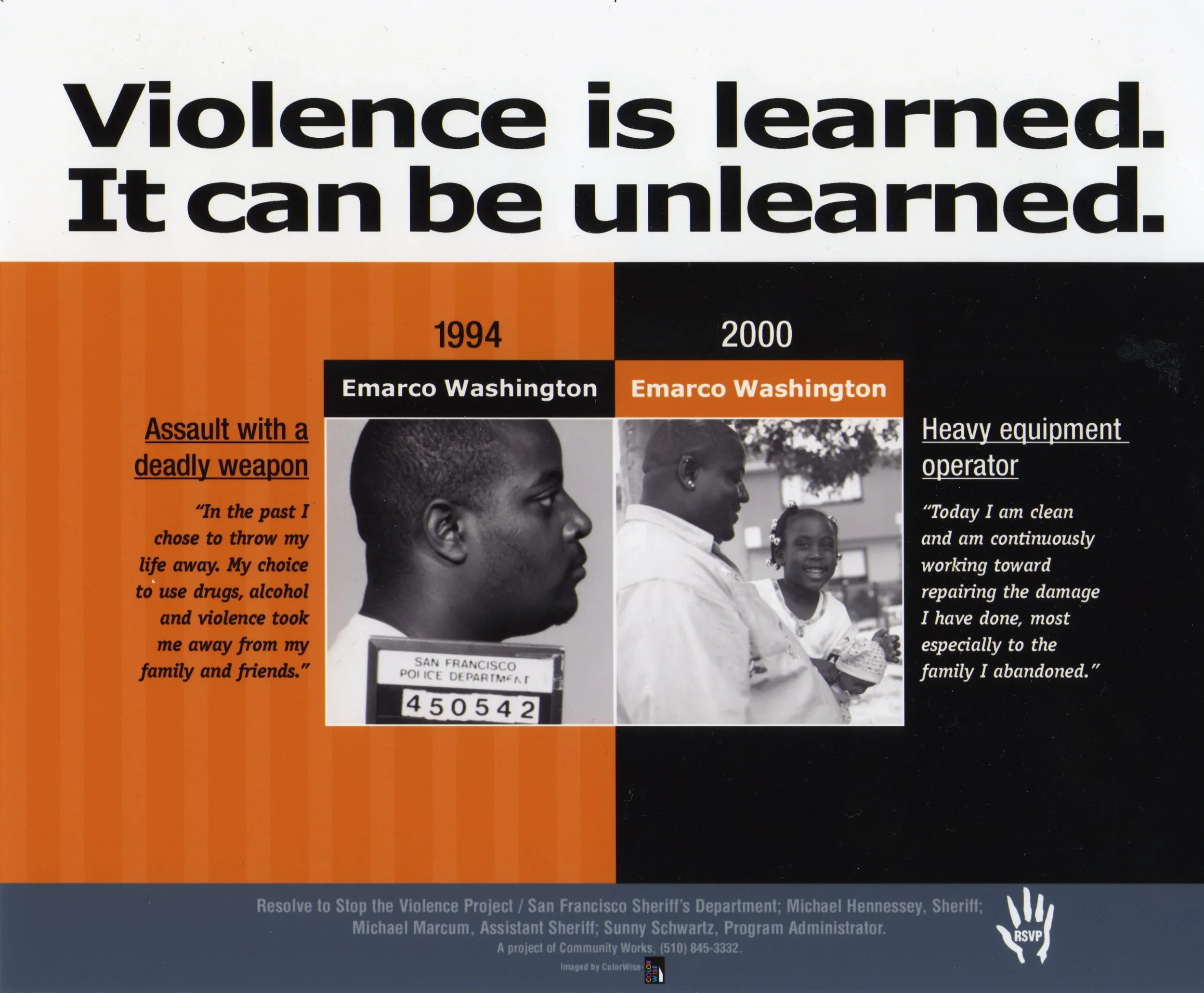 Ruth Morgan, Executive Director of RSVP collaborator Community Works West, is an accomplished photographer who has been using art as a tool for social change since the 1970's. Ruth created the "Record Breakers" series of posters and is credited with the photos featured on this page. The "Record Breakers" epitomize the triumph of the spirit and what can be achieved through enormous work: changing the monster factory to a place where offenders can learn to become pro-social citizens. Other featured photos include: offenders participating in manalive classes and victims of violence sharing their stories in jail-based Survivor Impact presentations.